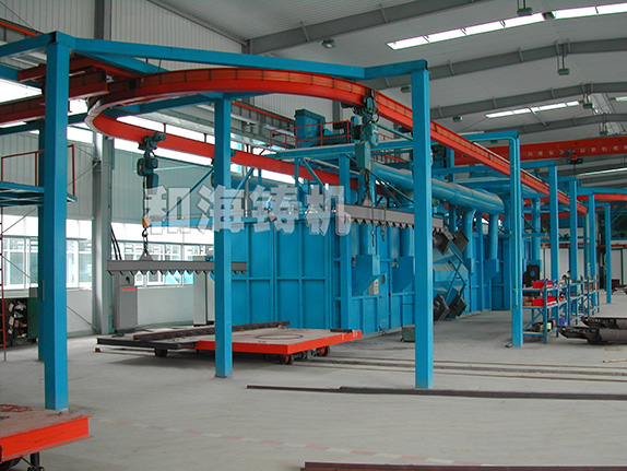 钢结构抛丸机工作原理 1.结构 本机主要功能部件是清理室,室内输送辊道与进出输送辊道、抛...